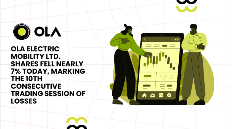 Ola Electric Mobility Ltd. shares fell nearly 7% today, marking the 10th consecutive trading session of losses, as investor concerns deepen over the company’s service infrastructure and declining market share amid intensifying competition in India’s electric two-wheeler space.