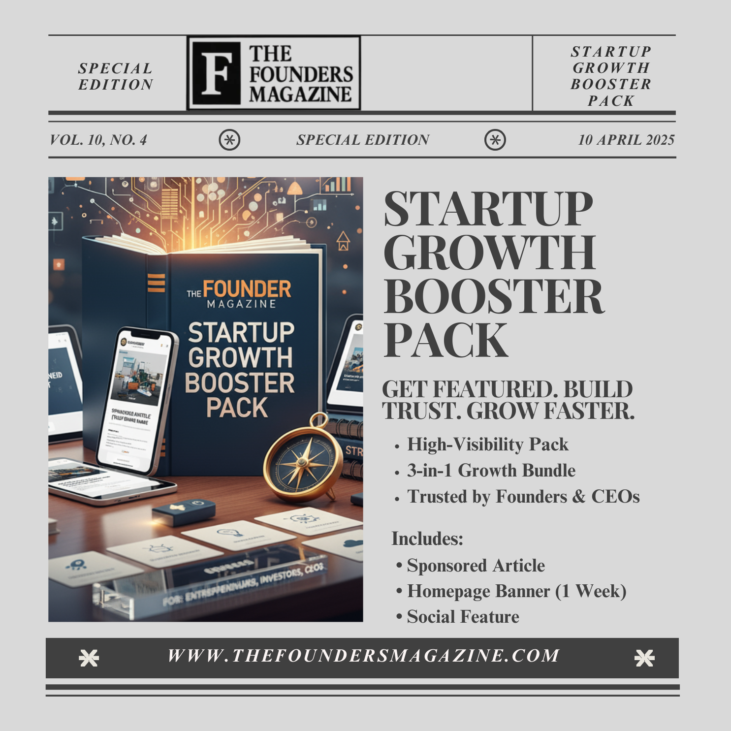 This high-impact bundle places your brand directly in front of founders, investors, business leaders, and decision-makers, leveraging The Founders Magazine’s premium audience and authoritative platform.